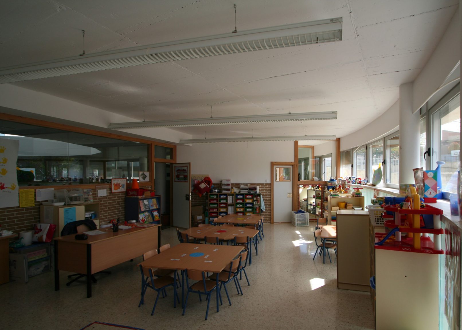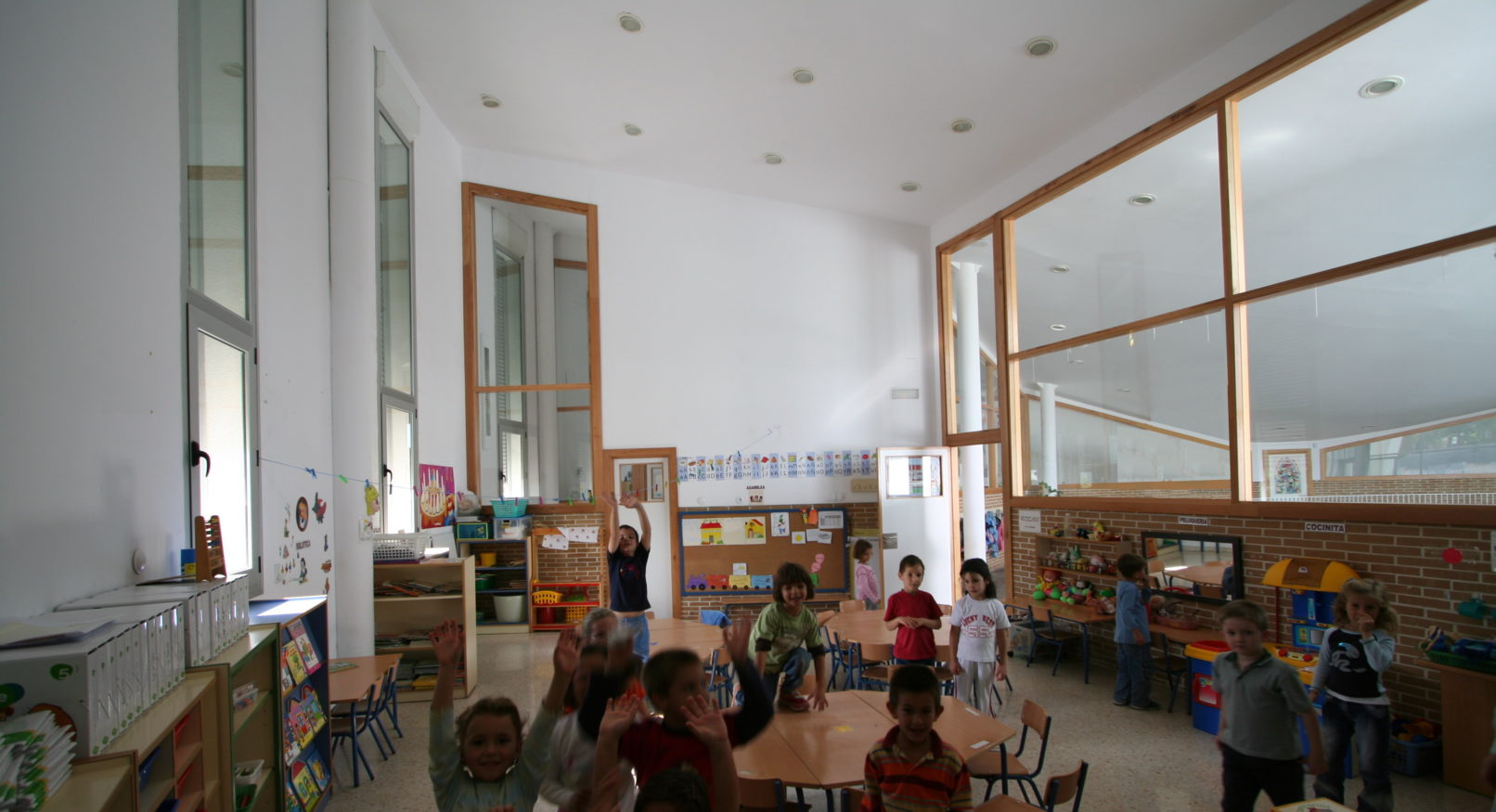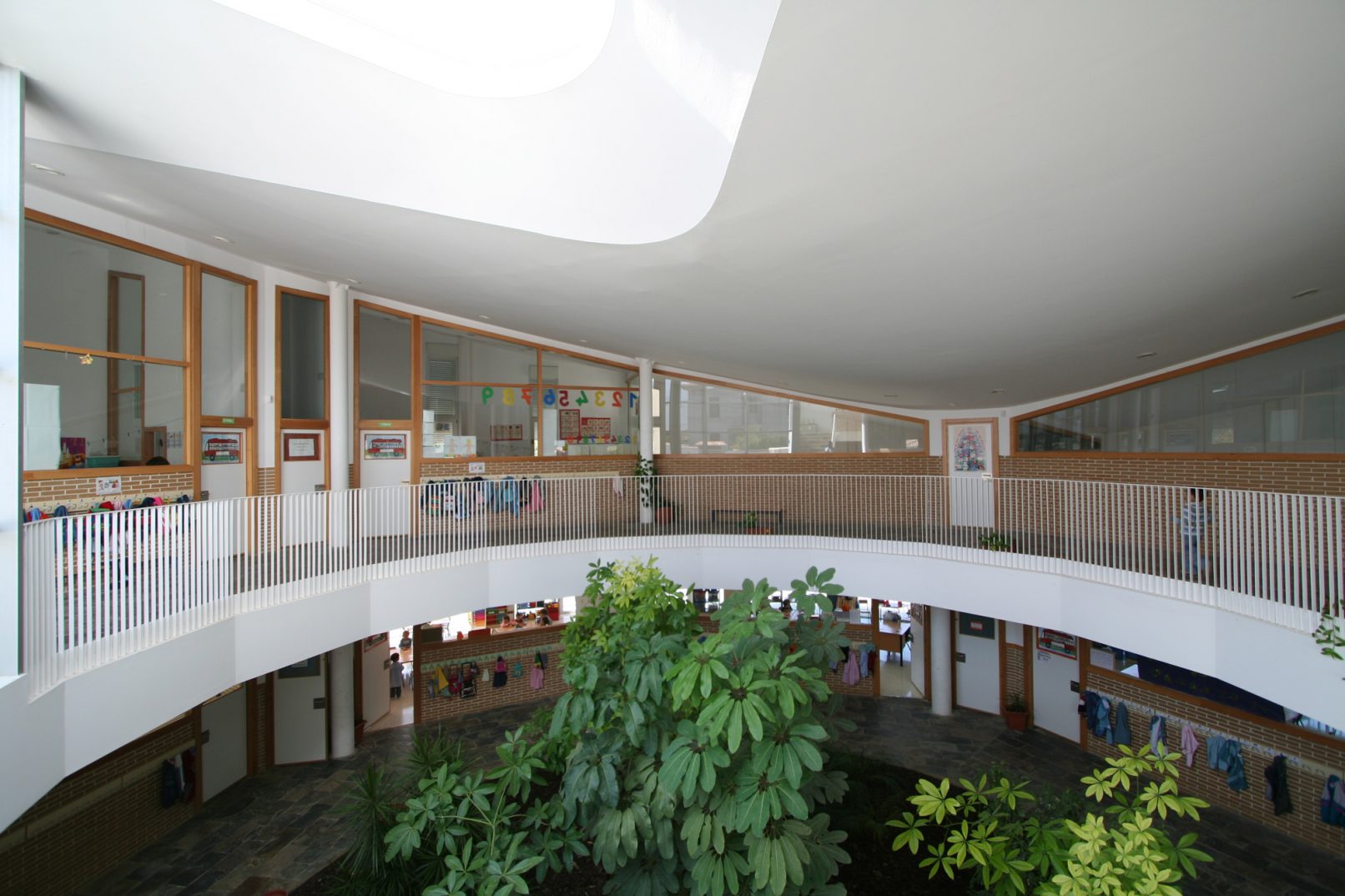 Un immeuble de trace compacte, deux hauteurs en section, toutes les deux accessibles au niveau des différents endroits de la parcelle. C´est un programme d´étage circulaire, avec les six salles de cour de maternelle et la salle polyvalente dans le périmètre du bâtiment et les zones de circulation à l´intérieur, autour de l´espace aménagé en espaces verts. Cette plante est partiellement occupée au-dessus par une autre dans laquelle se situent trois salles de cour en plus, et le bureau et la salle des professeurs dans le côté extérieur de l´enceinte et les couloirs communs à l´intérieur. Le périmètre extérieur de cette plante ne se concorde pas exactement avec celui de l´inférieure, mais nous provoquons un certain déplacement, pour forcer une taille à l´extérieur avec des jeux séducteurs d´ombres. Néanmoins le périmètre intérieur coïncide avec la projection de la zone inférieure aménagée en espaces verts, sur laquelle il se montre.