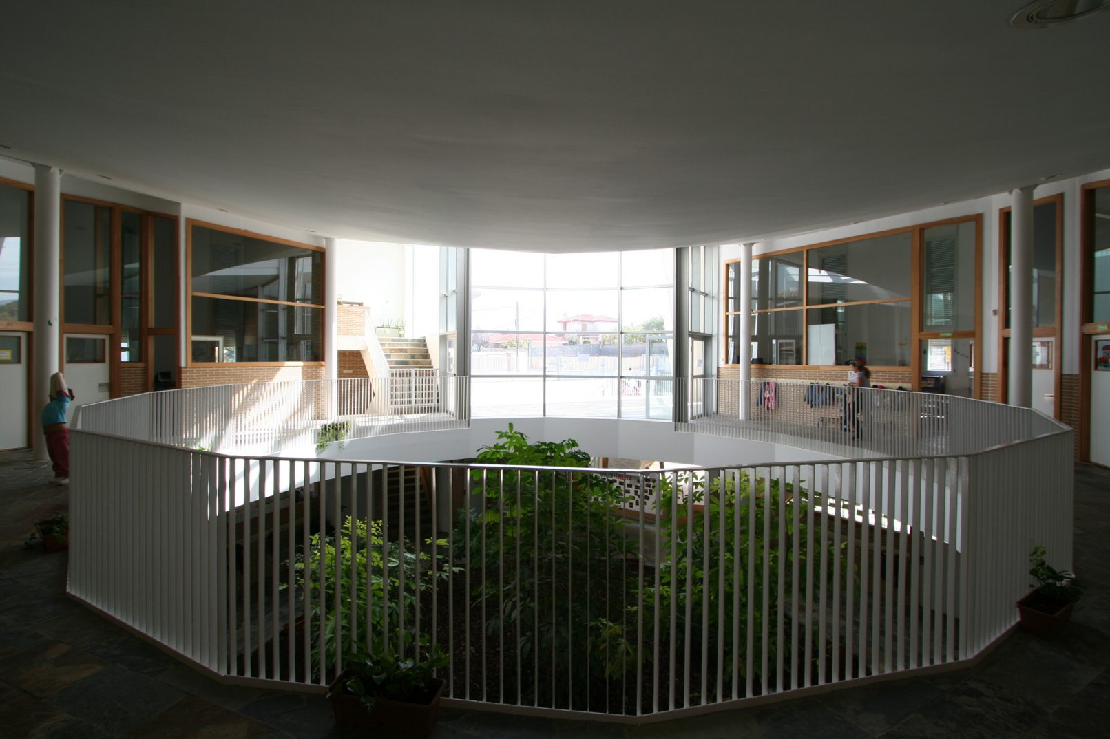 A building which leaves a compact trace, with a cross-section of two floors, both accessible from different points of the plot. The circular layout houses the first six infant classrooms and the multi-purpose room on the perimeter of the building and the transit zones on the inside around the landscaped garden. This level is partially covered by another where we placed three more classrooms, a staff room and an office on the outside of the building and transit zones on the inside. The outer perimeter of this floor does not coincide exactly with that of the lower level, our intention being to set things slightly off-centre, making a sharp division in the outer mass to create a play of light and shade. The inner perimeter overhangs the garden below, and exactly matches its vertical projection.