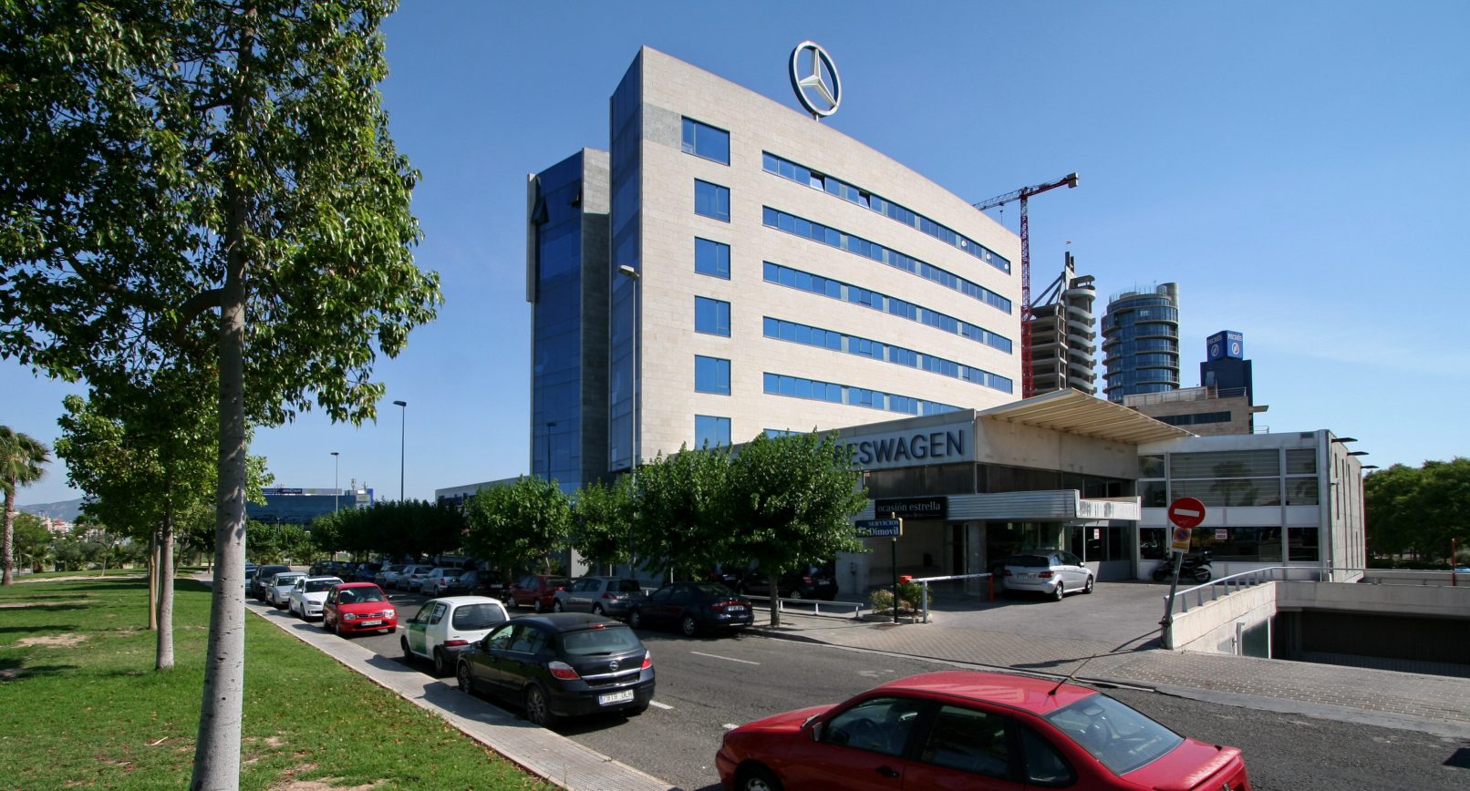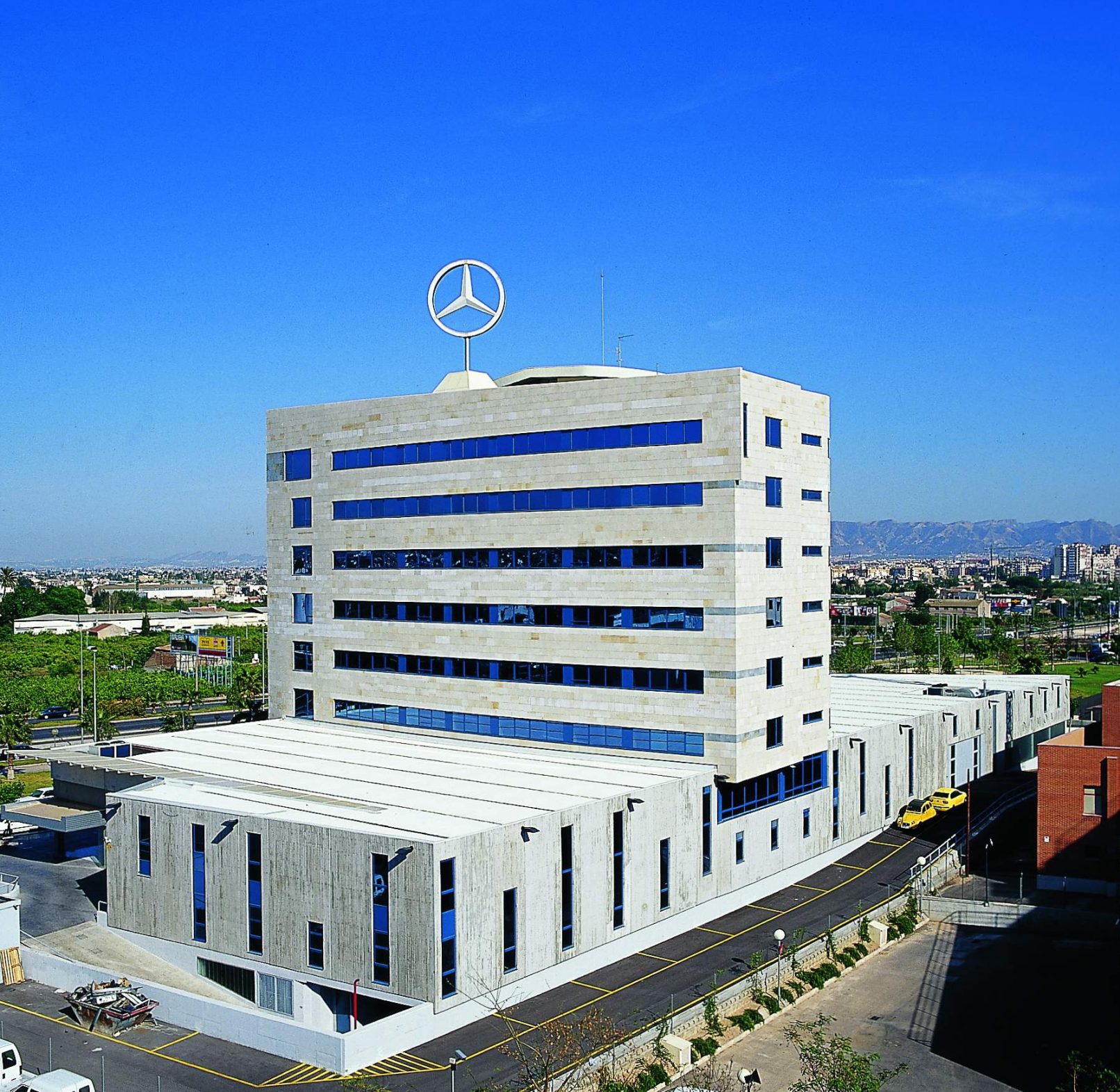 Edificio híbrido en Murcia (España), que incorpora en un mismo edificio, una torre de oficinas, dos concesionarios de vehículos, taller y aparcamiento.