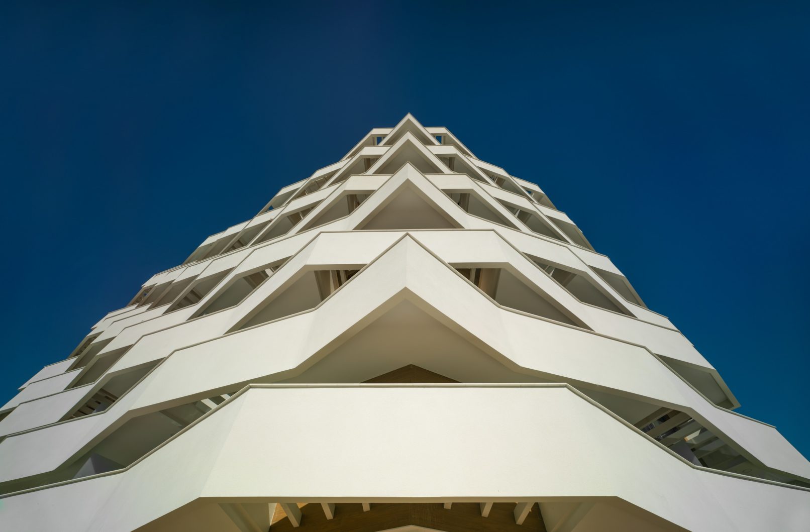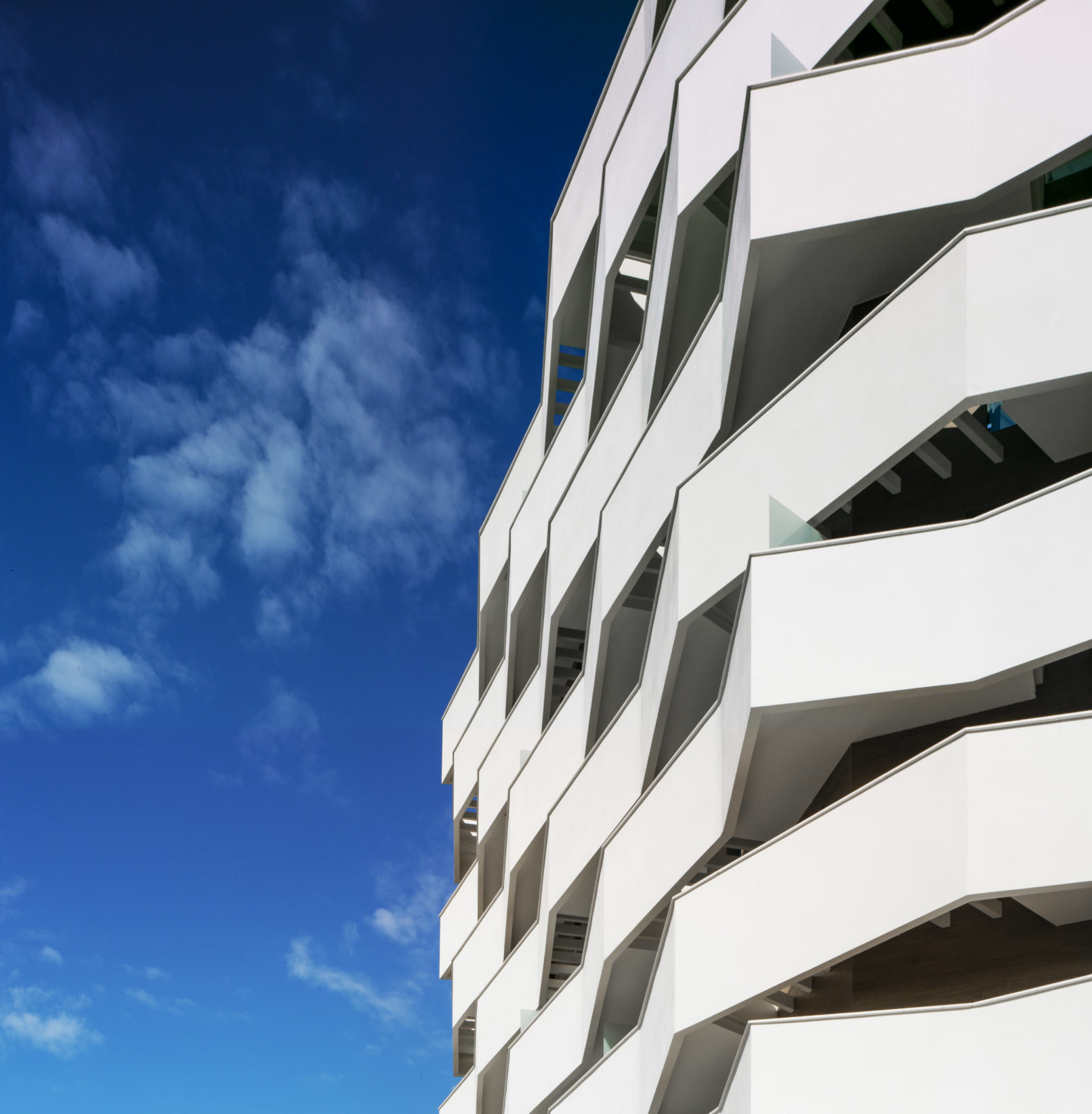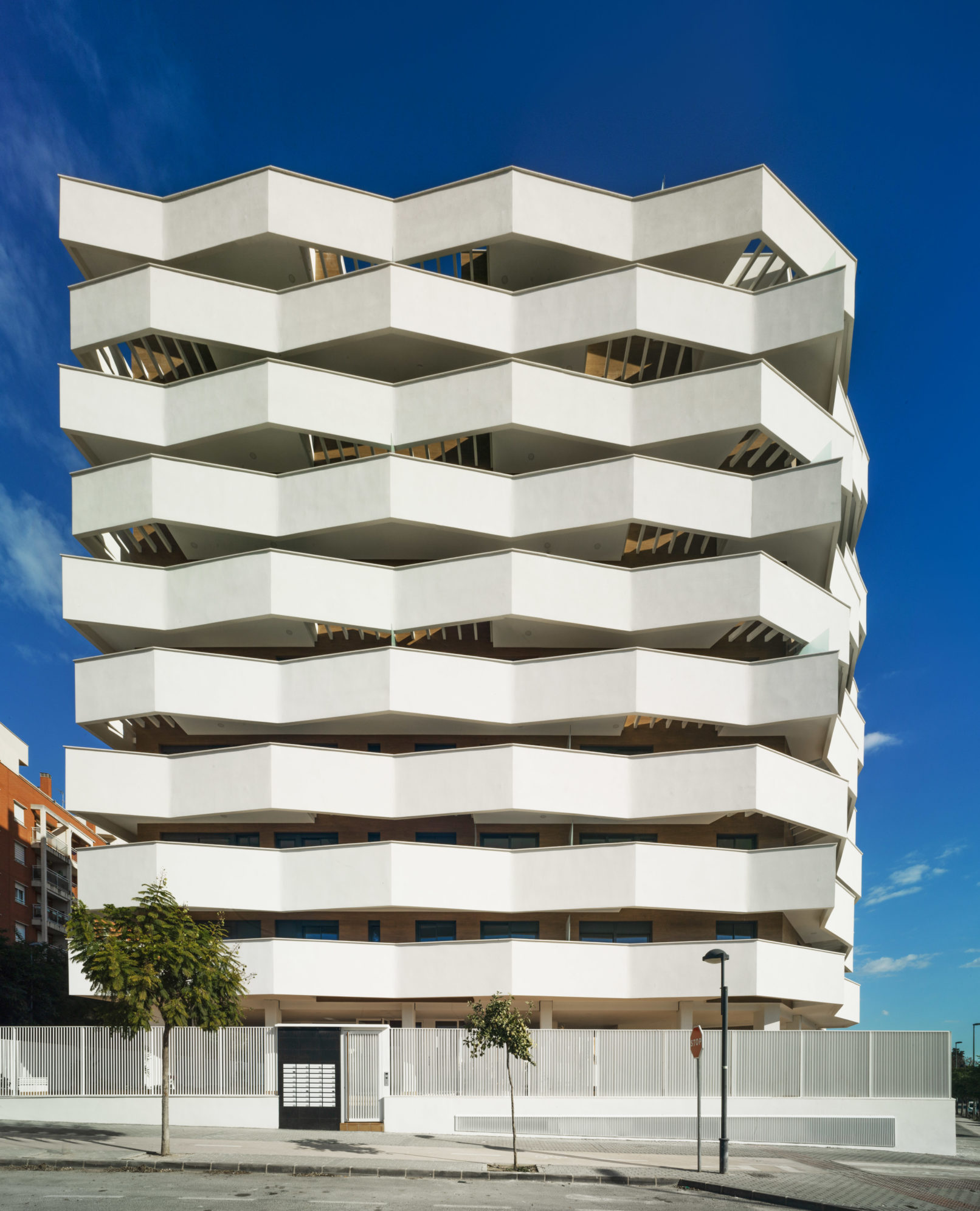 La fachada juega con una composición zigzagueante con seductores efectos dinámicos.