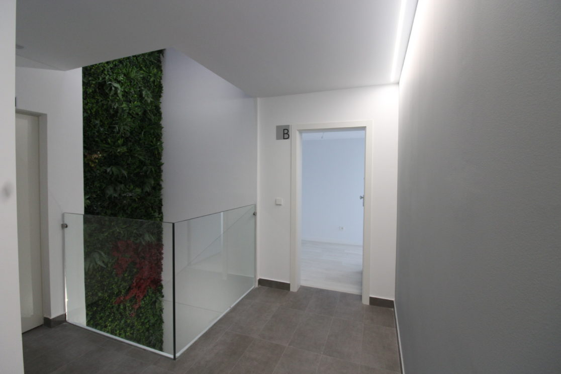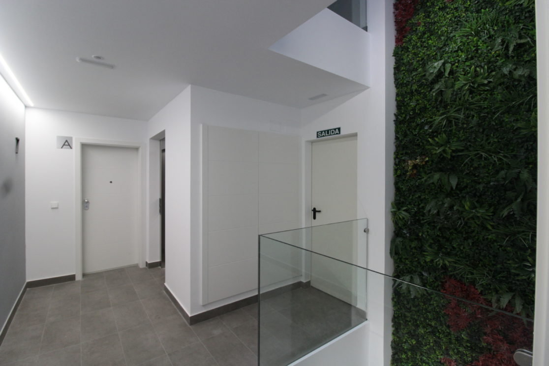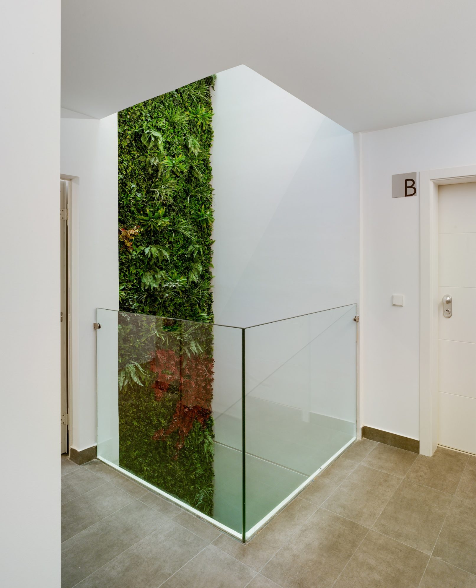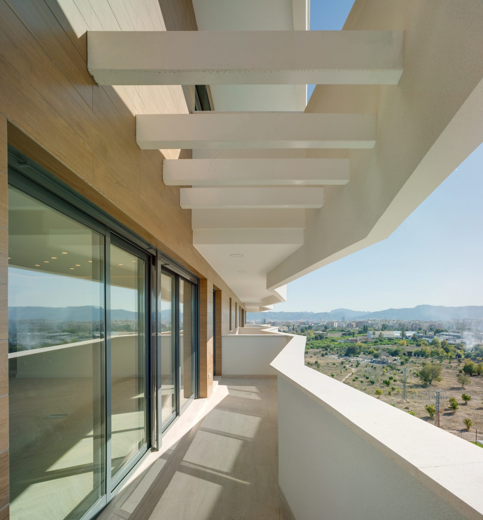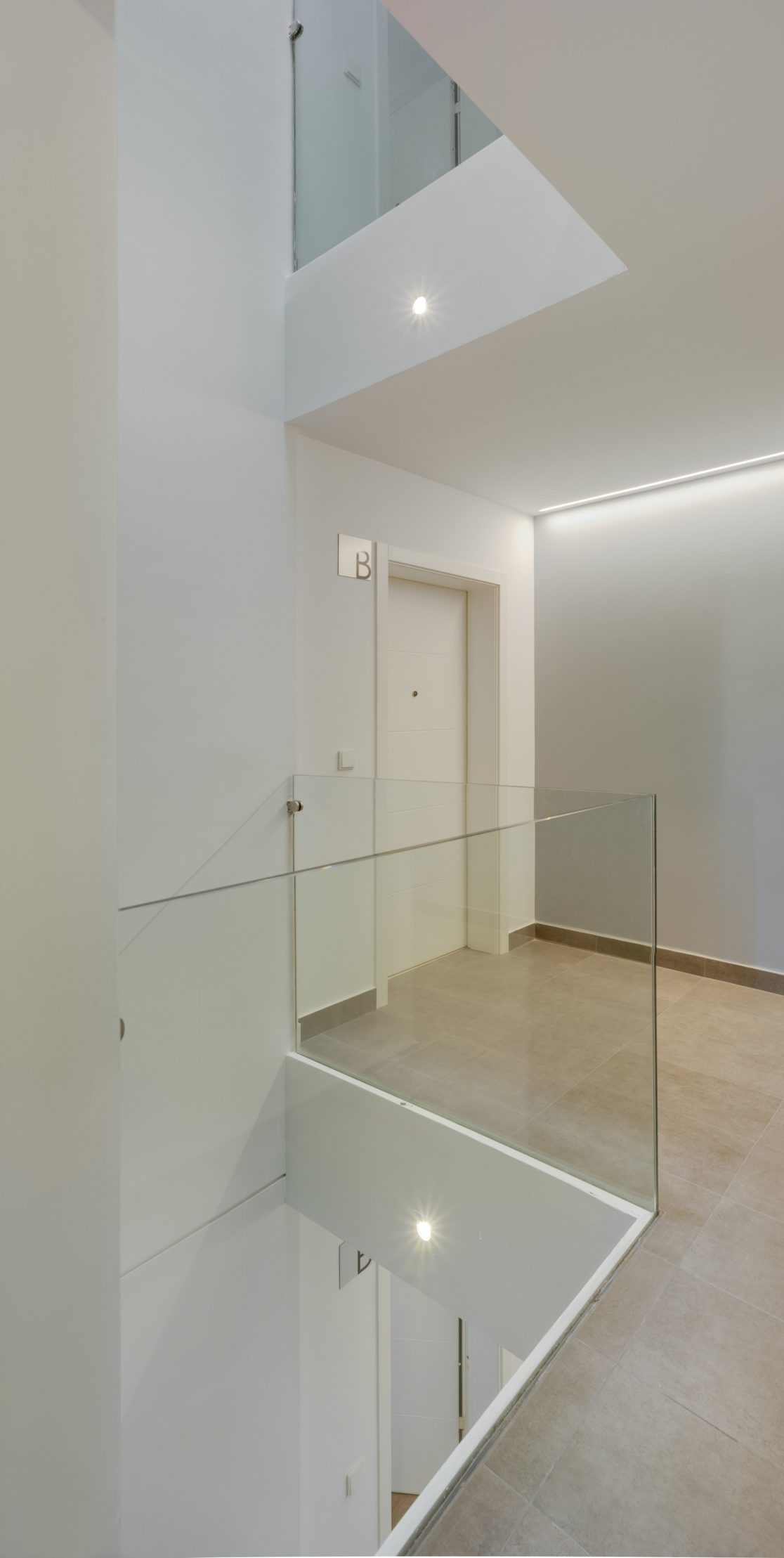 En edificio agota el máximo de alturas, asumiendo no maximizar la huella máxima de cada planta. Para ello, secundamos una doble estrategia, no ocupar el fondo edificable y vaciar el interior del edificio con espacios a doble altura, proporcionando salones de vivienda de gran prestancia. Gracias a un complejo pero ingenioso artificio, diseñamos salones de generosa altura. Así mismo, para favorecer aún más su carácter, se disponen en el sentido longitudinal de la alineación, no al modo transversal como es habitual, disfrutando de este modo de una notable longitud de fachada. Enormes terrazas frente a la pieza del salón-comedor y accesibles desde el mismo, fortalecen el carácter extraordinario de su diseño.