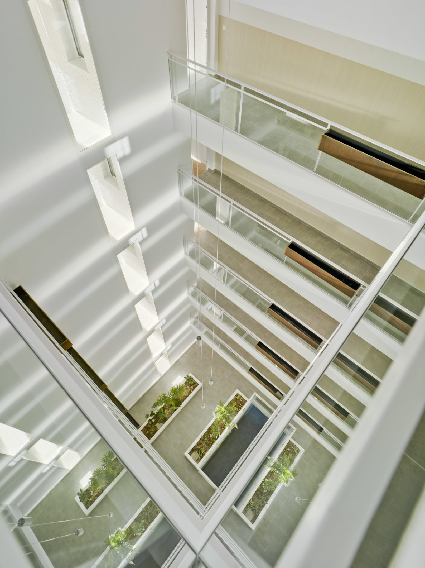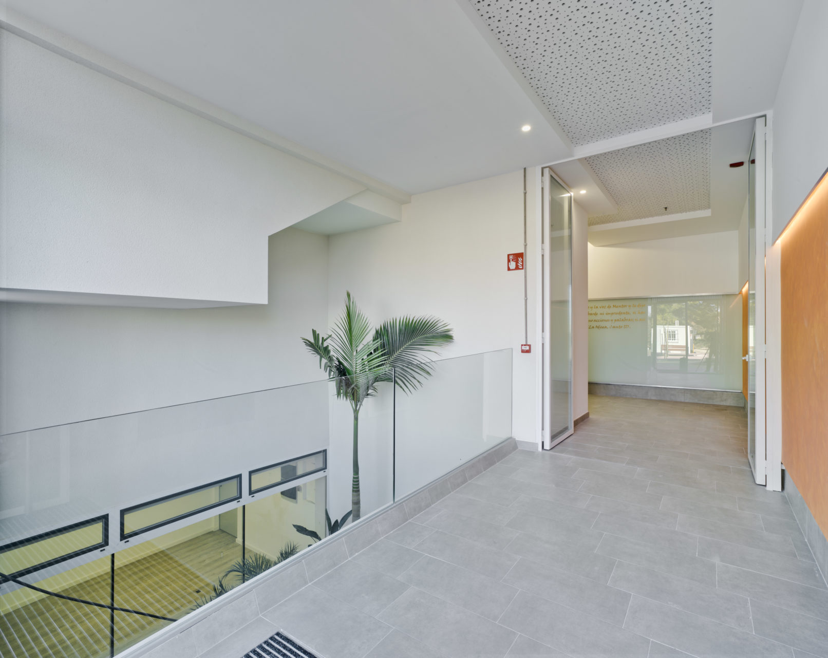 Nuestra propuesta, sin embargo, consiste en vaciar el interior del edificio creando un foyer interior de gran altura, ajardinado y consintiendo las vistas y entrada de luz natural desde el exterior. A este espacio vacío se abren los  de espera de ascensores y los pasillos de ingreso a las viviendas. Tal estrategia permite igualmente que los espacios de aseo cuenten con una entrada de luz natural perimetral en su parte alta. En planta primera, se crea un lugar comunal con alcorques de vegetación. Por tanto, solución de gran eficiencia funcional y distributiva con meritorio valor espacial.