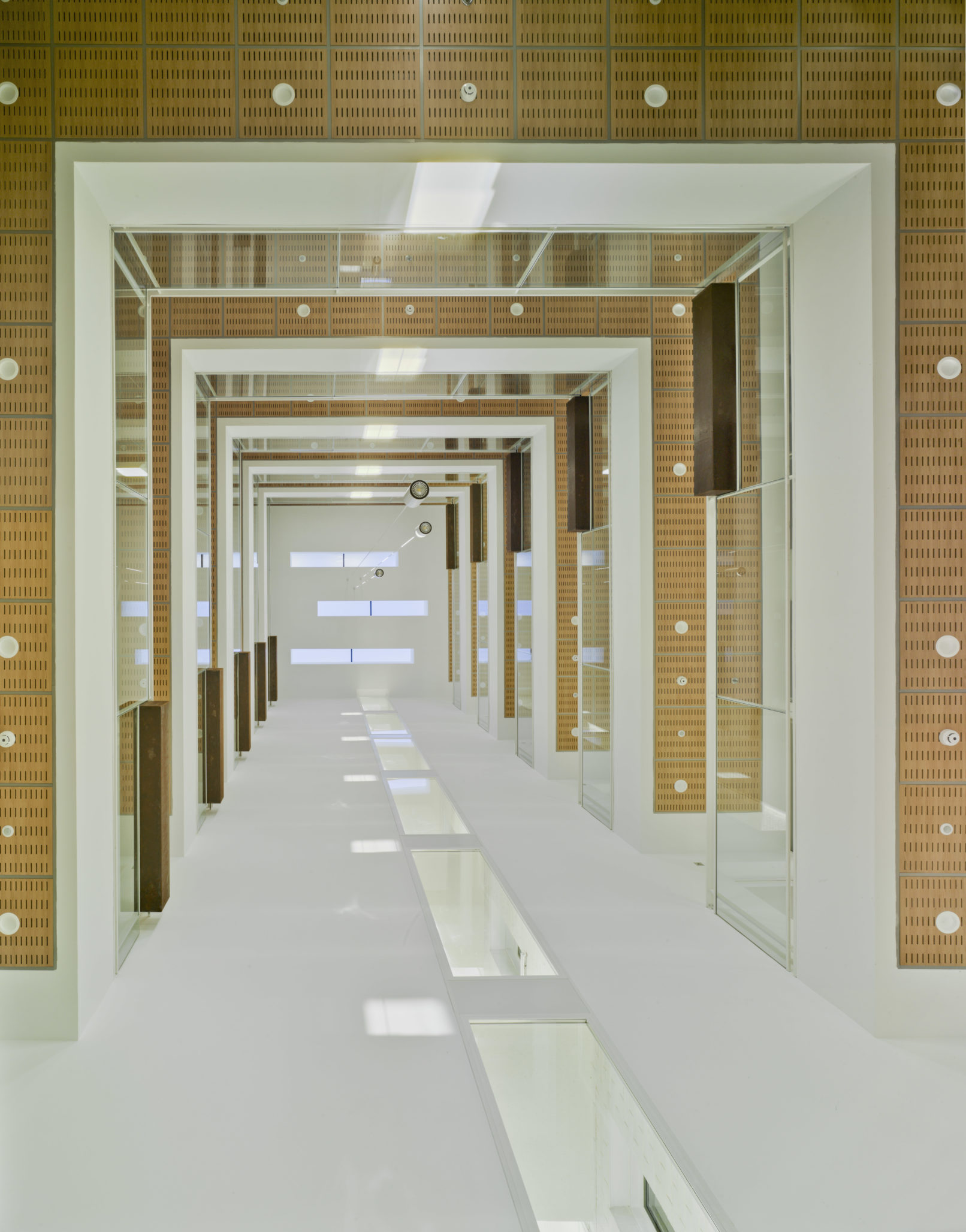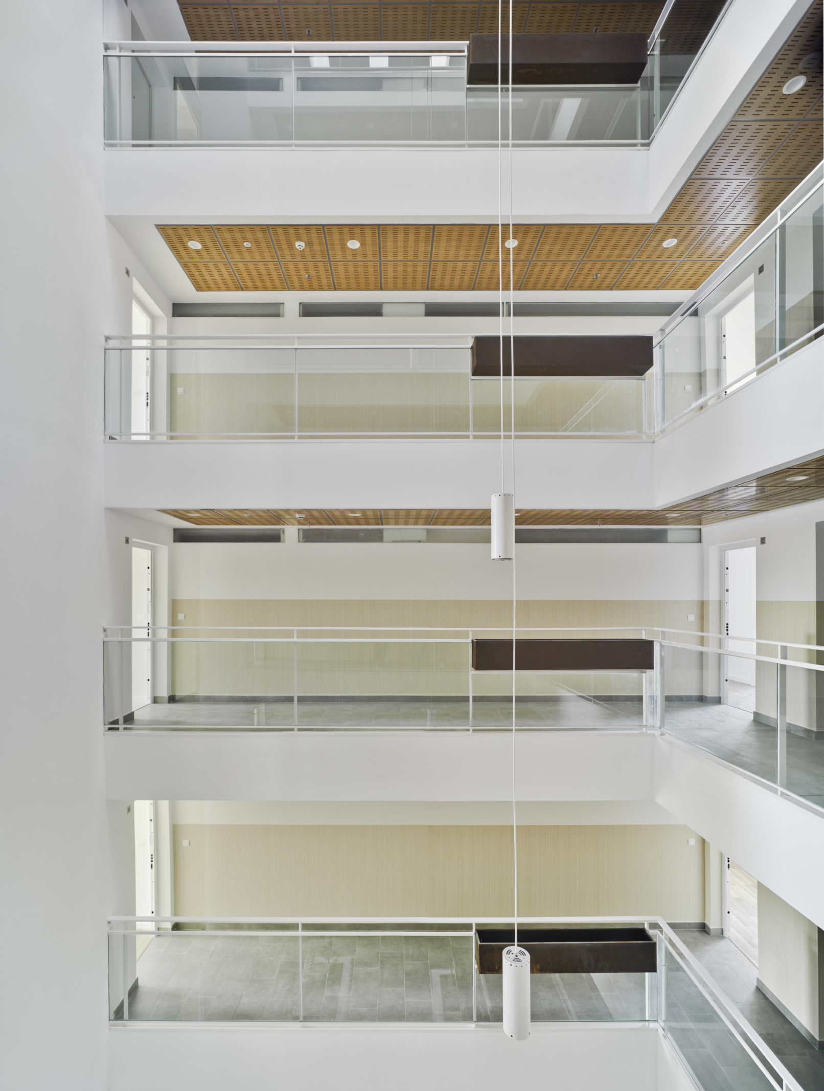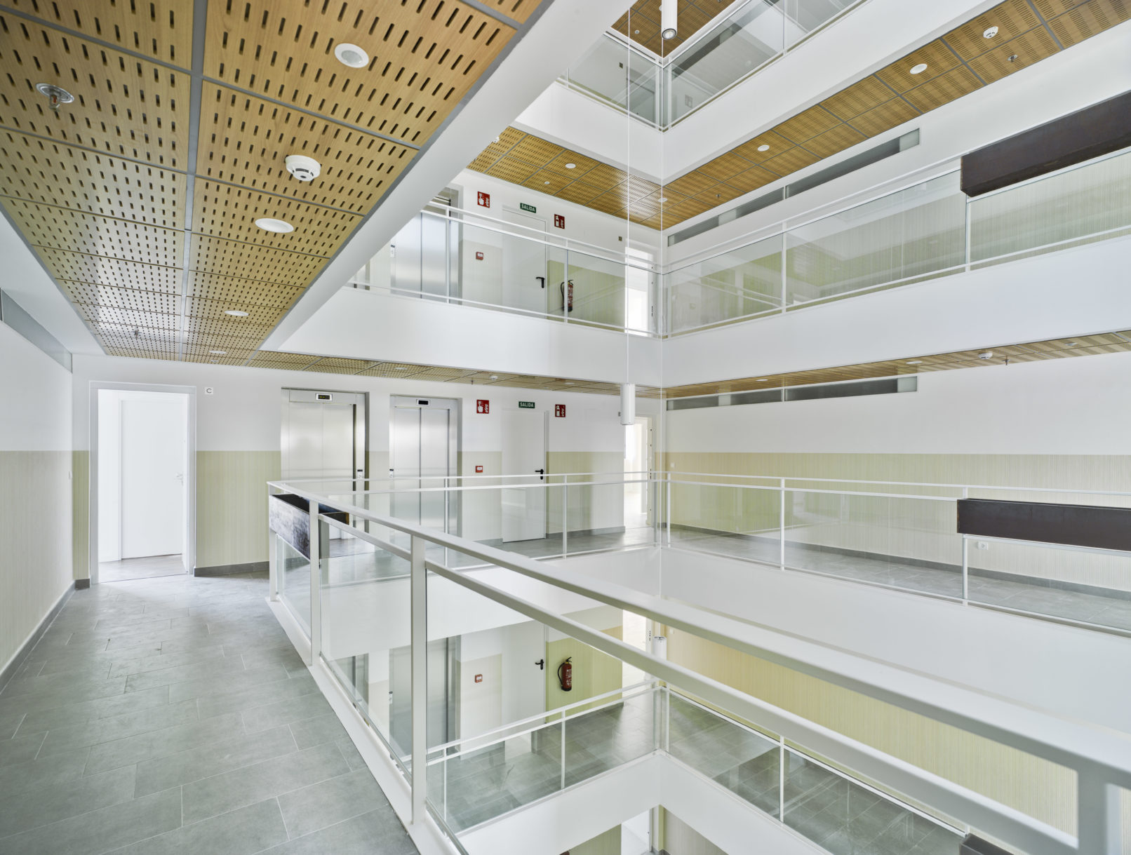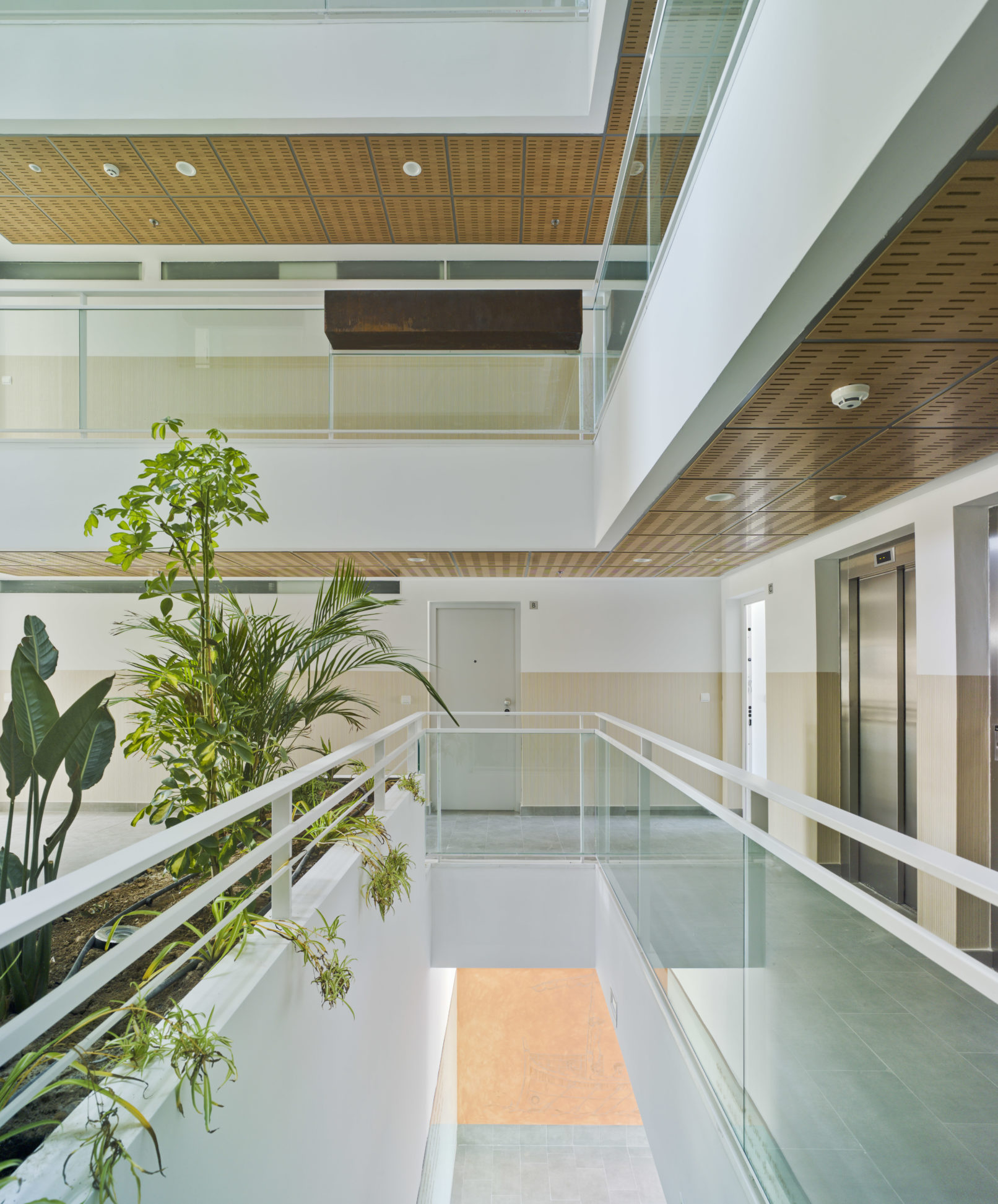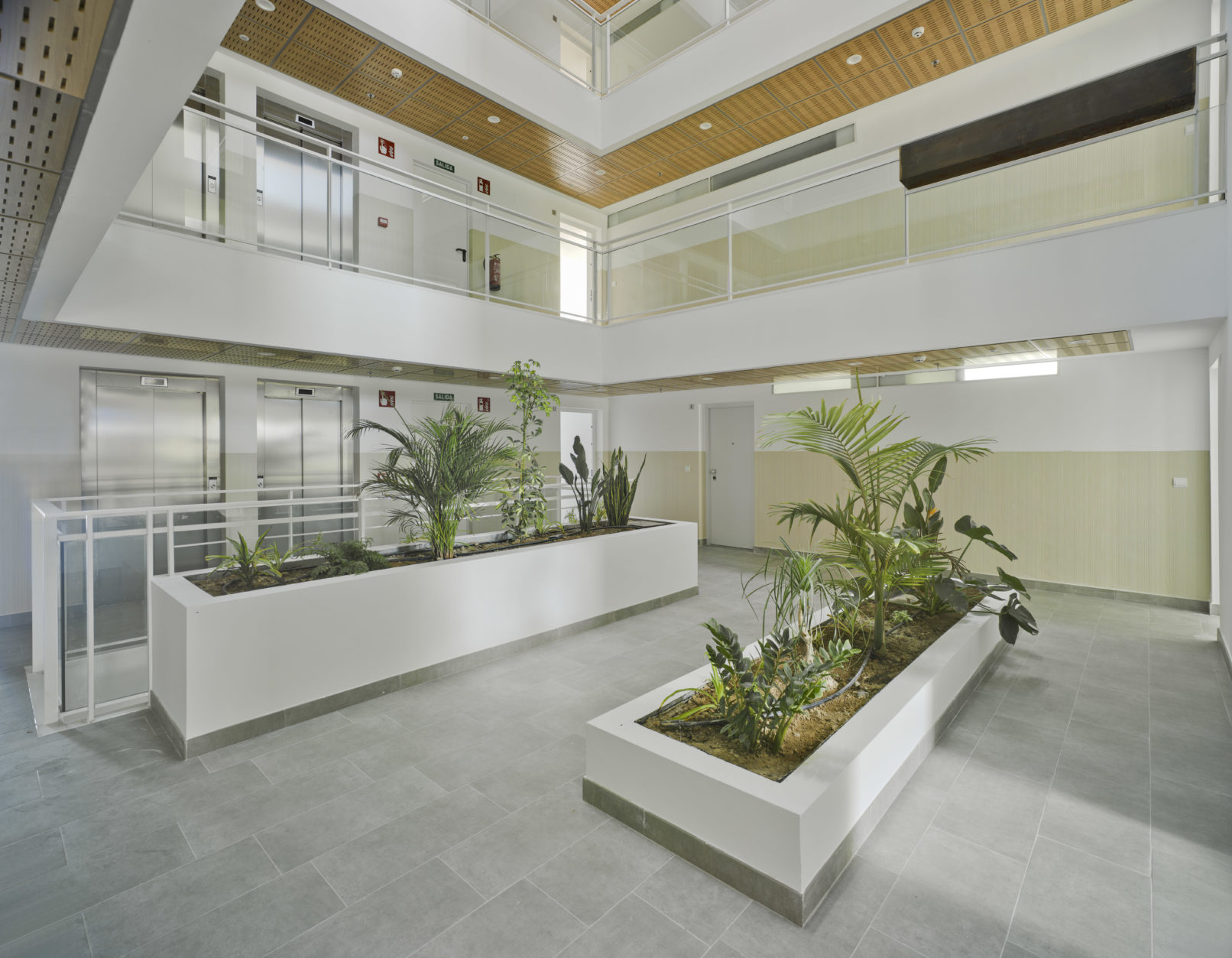 El portal de las viviendas tiene comunicación visual con un gran foyer a cota de planta primera. Nuestra estrategia de diseño ha sido evitar un distribuidor vecinal por planta, ubicado en el centro del edificio y de ridículas dimensiones que diera acceso a las correspondientes viviendas. Esta solución, usada habitualmente, obliga a que las viviendas tengan un patio interior al que vuelca la cocina o incluso diversas habitaciones. La solución tiene grandes inconvenientes de tipo funcional, aportando un nulo valor social a los espacios comunes de distribución.