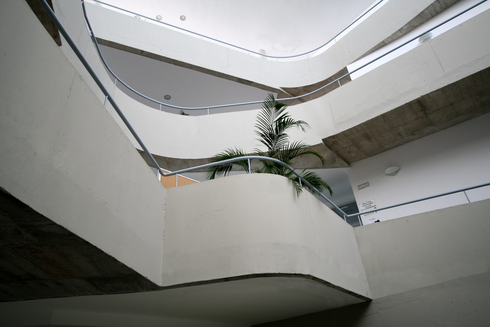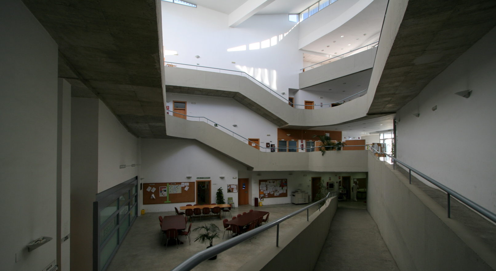 Una gran rampa que se desarrolla sobre sí misma en deformada espiral. Nace a nivel de la calle para ascender en suave pendiente enrollándose sobre sí misma y rodeando un espacio interior a toda la altura, iluminado cenitalmente. En la parte exterior de esta cinta de moebius ubicamos las aulas y en el perímetro interior el pasillo de distribución. Aulas muy accesibles para el alumno, de fácil localización y referenciación, que permiten un intercambio social, cultural y humano. La segunda unidad incluye el programa administrativo, departamental y de dirección. Se trata de un edificio desarrollado en altura, conectado con el área docente en los puntos donde coinciden (planta baja, primera y segunda). Así mismo contribuye a crear una referencia en el contexto urbano donde se encuentra. En una tercera área hemos ubicado el espacio de lo audiovisual y tecnológico, elemento clave de la pedagogía de los idiomas. Se asienta en un vaso semienterrado, proyección de lo ocupado por el resto de la edificación. Está iluminado y ventilado por el perímetro aprovechando el desarrollo inclinado de la zona de aulas.