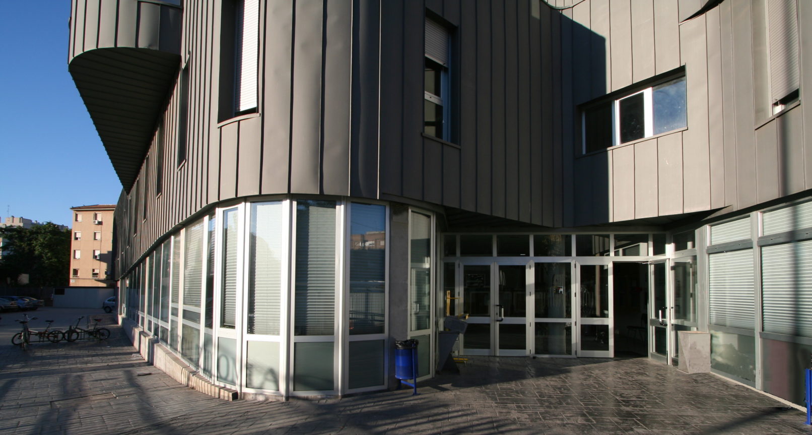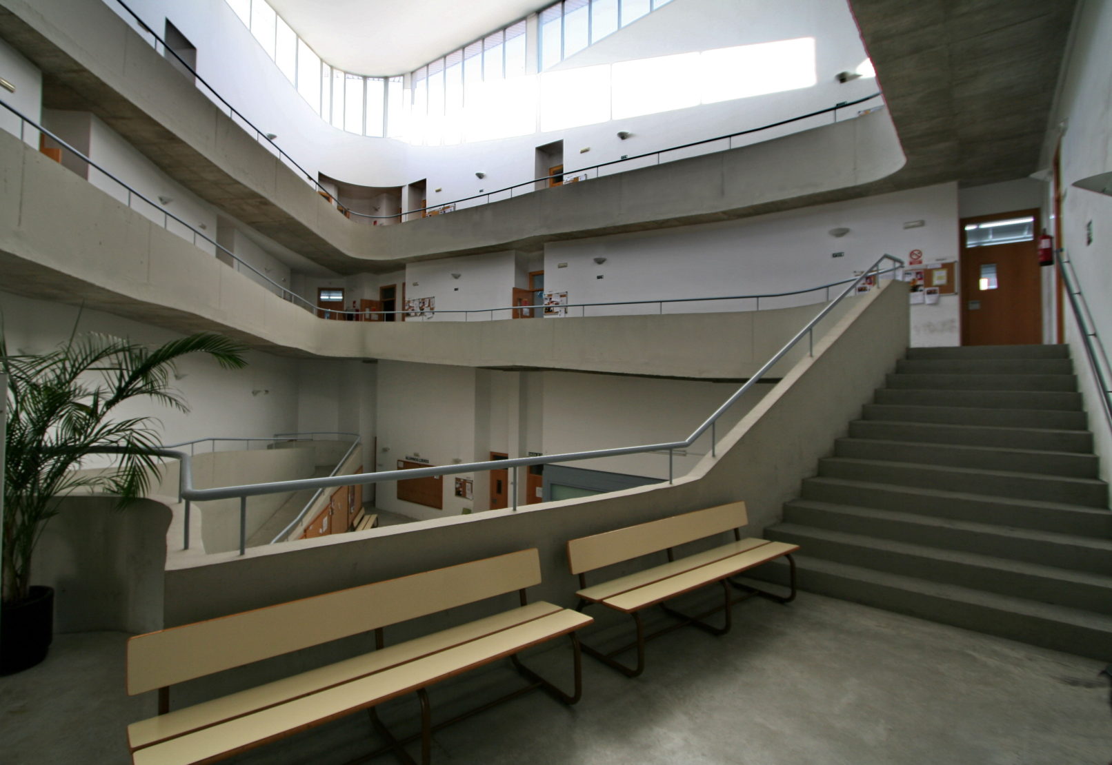 Une grande rampe se déroule sur elle-même sous la forme d´une spirale déformée. Elle surgit à la hauteur de la rue pour monter en douce pente roulant sur elle-même et entourant un espace intérieur à toute hauteur, illuminé d´une forme zénithale. Dans le côté extérieur de ce ruban de moebius se situent les salles de cour ; dans le périmètre intérieur se situe le couloir. Ce sont des salles très accessibles pour l´élève, de localisation et références faciles, qui permettent un échange social, culturel et humain. La seconde moitié comprend le programme administratif, départemental et de la direction. Il s´agit d´un immeuble qui grandit en hauteur, raccordé avec la zone enseignante aux points qui coïncident (rez-de-chaussée, premier et deuxième étages). De même, il contribue à créer une référence dans le contexte urbain où il se trouve. Dans une troisième zone se situe l´espace de l´audiovisuel et technologique, élément clef de la pédagogie des langues. Il est fixé dans un vase mi-enterré, projection du reste de l´édification. Le périmètre l´ illumine et le ventile se servant de l´inclination de la zone des clases.
