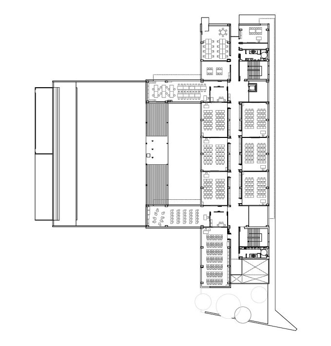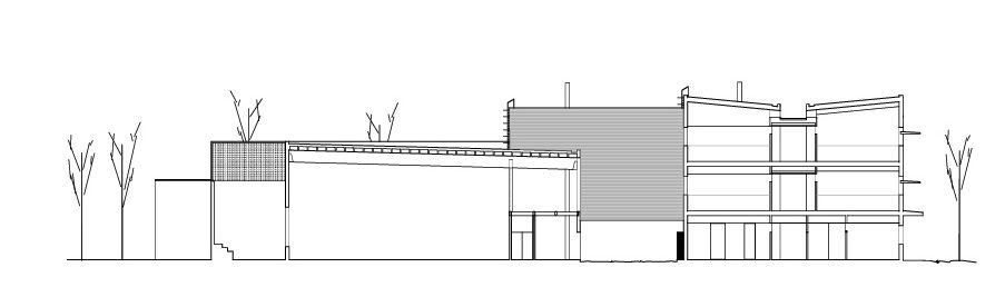 Edificio de unitaria lectura pero del que apreciamos un primer cuerpo de tres plantas de altura y desarrollo lineal que incluye los espacios de docentes y de gestión comunes. En otra pieza de menor altura y proporción casi cuadrada ubicamos el programa deportivo. Uno y otro se encuentran separados en planta baja por un espacio ajardinado, pero vinculados volumétricamente en plantas primera y segunda por sendos cuerpos volados.
