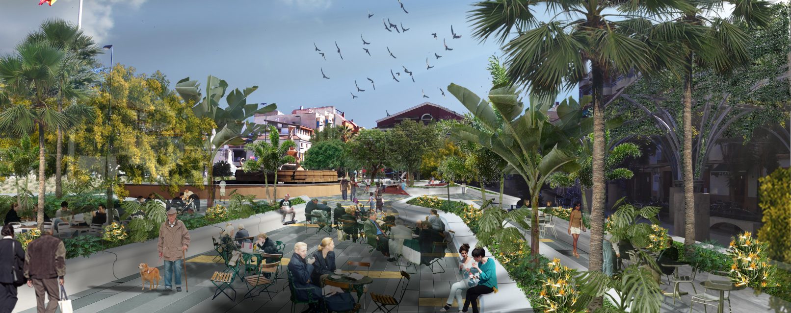 Otra plaza sobre la que trabajamos es la de Colon, sobre la que creamos zonas de sombra para fortalecer su potencial de uso, mejorando de su relación con el teatro municipal, el colegio y los locales de restauración.
