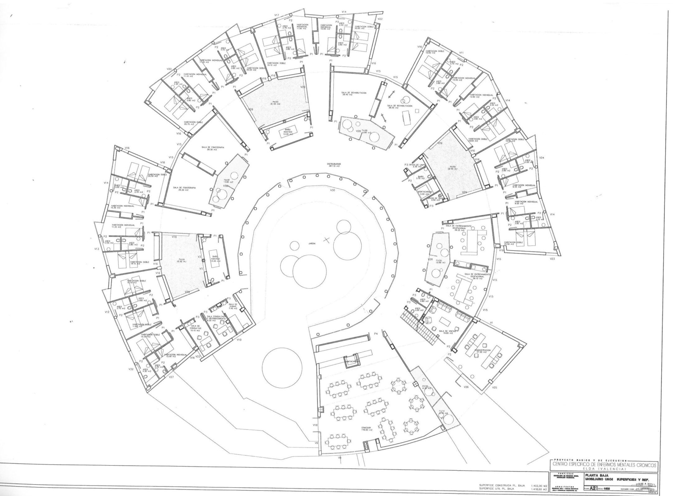 El edificio es por un lado introspectivo respecto de los espacios comunes de estancia y circulación, todos ellos vinculados a un espacio ajardinado de planta circular, pero también a otros patios de menor entidad dispuestos entre el corredor general y las estancia de los internos, que acaban ocupando el anillo exterior, abierto al paisaje y las vistas lejanas.