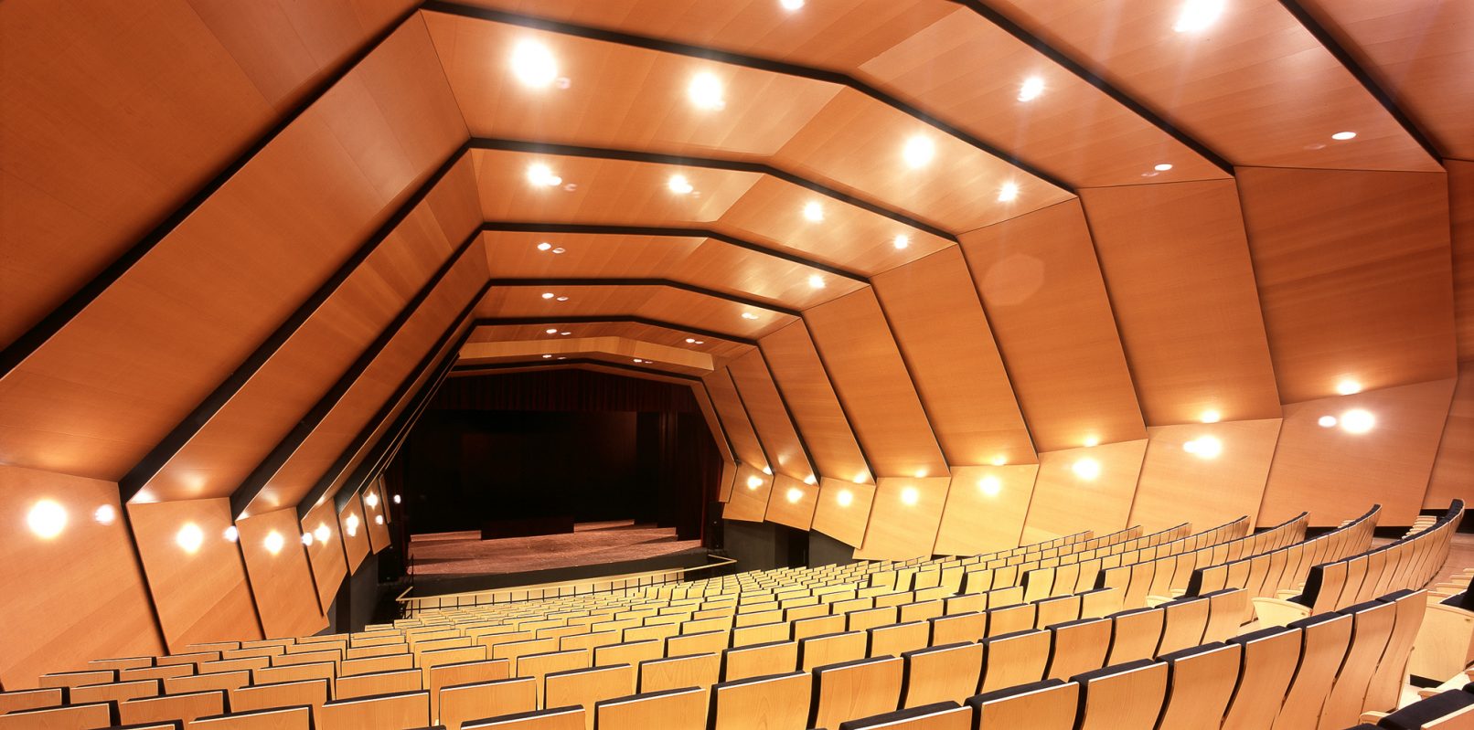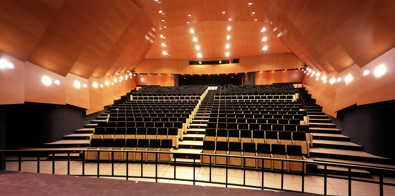 La gran sala de espectáculos, tiene una forma escultórica más femenina de planta abierta en arco. Una sala resuelta íntegramente en un solo nivel. La pendiente permite una visibilidad óptima.