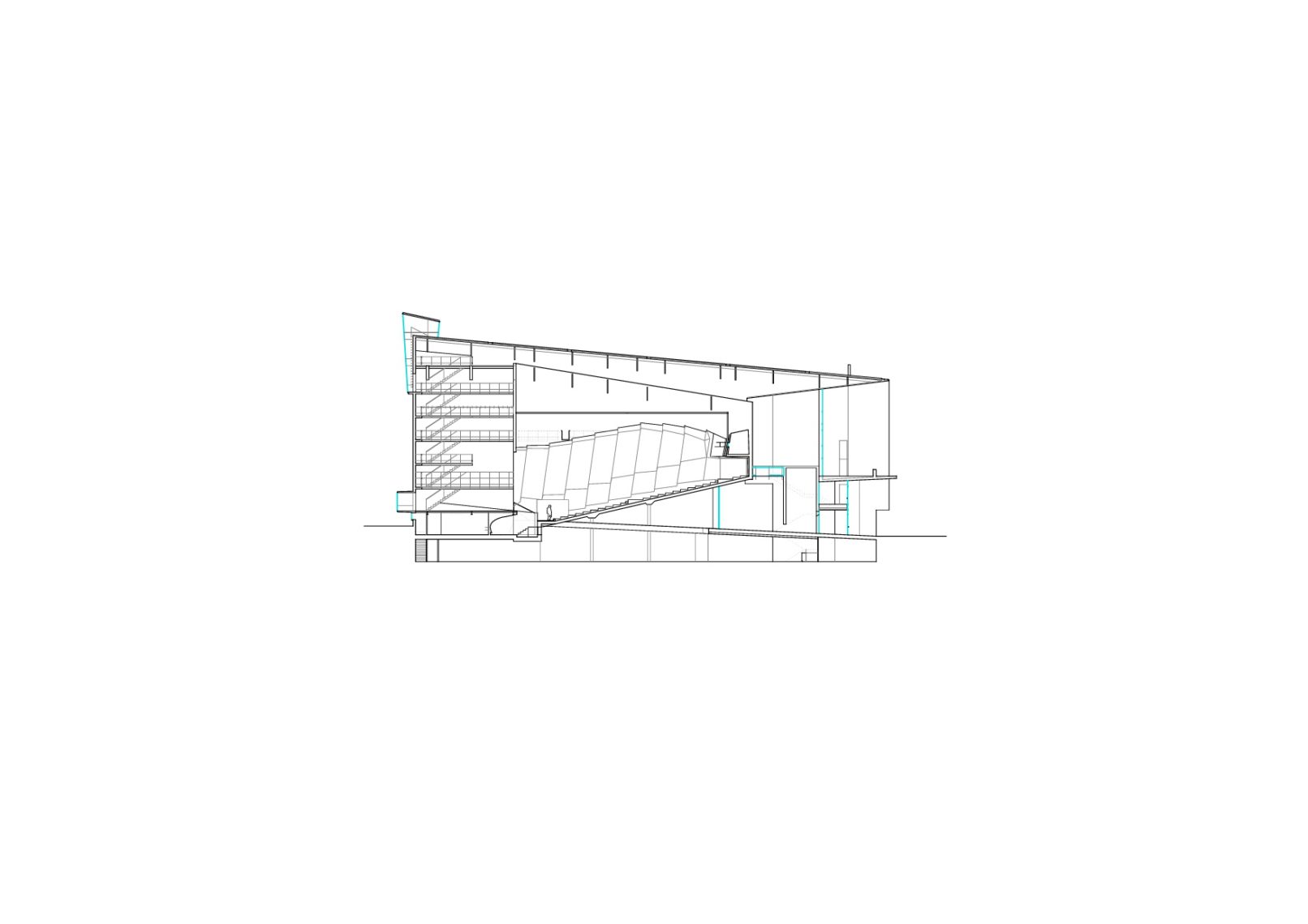 The second building, containing the associated areas, is more masculine and solidly rounded in appearance. The structure evokes an orthogonal crystal that melds with the concert hall, partially enclosing it and then allowing it to show through only again.
