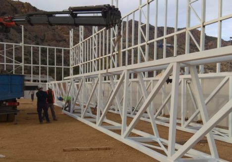Comienza a tomar forma la estructura metálica del pabellón deportivo que estamos dirigiendo en Alhama de Murcia. Tras un azaroso inicio de los trabajos, se completa esta semana el izado de las grandes cerchas espaciales de la cubierta del centro deportivo promovido por el Ayuntamiento. Una grúa de setenta toneladas alza los elementos de cubierta…